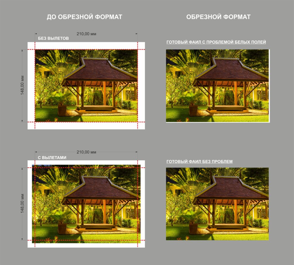 Существует два формата макета: дообрезной (с вылетами под печать) и обрезной (готовый вид изделия). Если в макете есть цветной фон, то типография принимает файлы только в дообрезном виде.