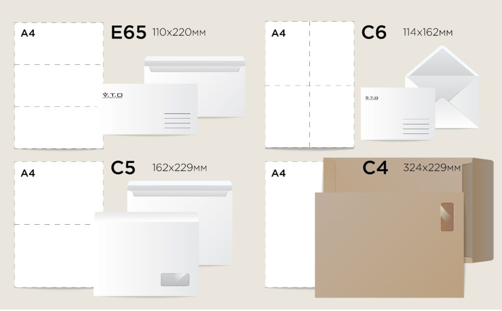 – для отправки почтовых писем – конверты с боковым прямым клапаном, с окном либо без окна, конверты с треугольным верхним клапаном (если есть необходимость сургучной печати), рекомендуемые размеры – С6, Е65.