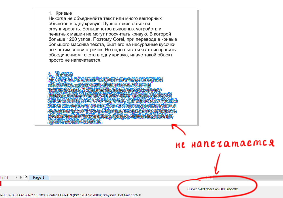 Никогда не объединяйте текст или много векторных объектов в одну кривую. Лучше такие объекты сгруппировать. Большинство выводных устройств и печатных машин не могут просчитать кривую, в которой больше 1200 узлов. Поэтому Corel при переводе в кривые большого массива текста бьет его на несуразные кусочки по частям слов и строчек. Не надо пытаться это исправить объединением текста в одну кривую, иначе такой объект просто не напечатается.