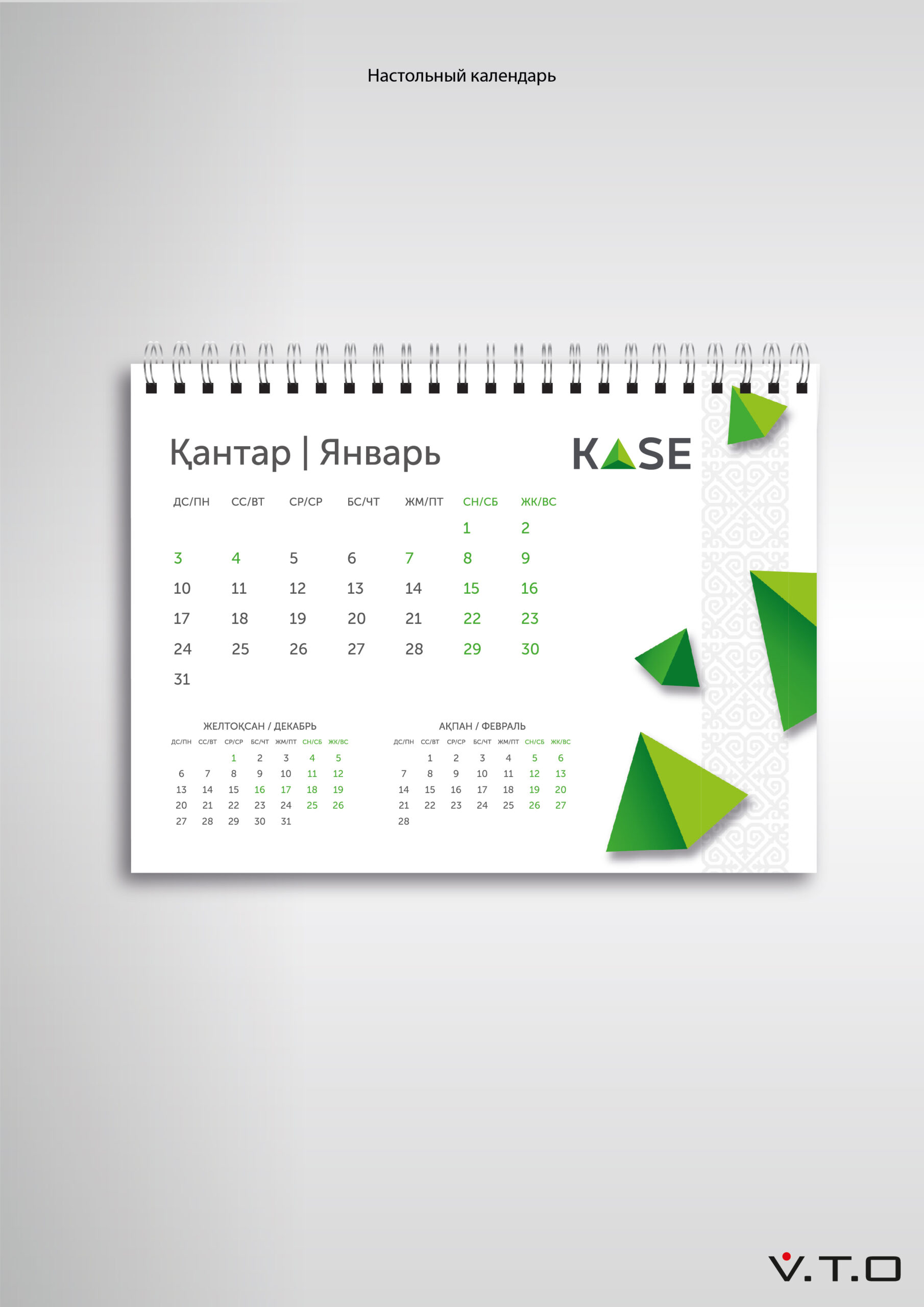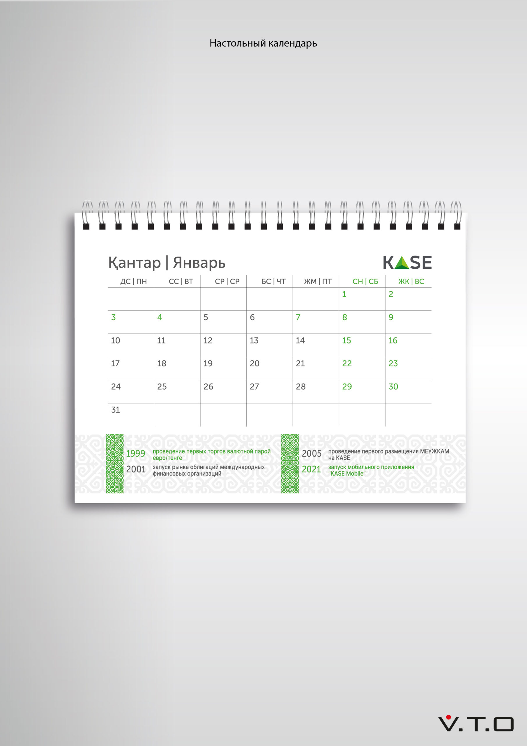 Дизайн настольного календаря для Казахстанской Фондовой Биржи (KASE). Создание данного календаря было приурочено к 30-летию независимости Республики Казахстан. Основным пожеланием было использование орнамента на страницах и обложке календаря и в целом сочетание современного стиля с традициями с учетом корпоративного стиля компании. В каждом месяце страниц календаря содержится информация о ключевых событиях из жизни компании. На обложке – выборочный лак и припресс.