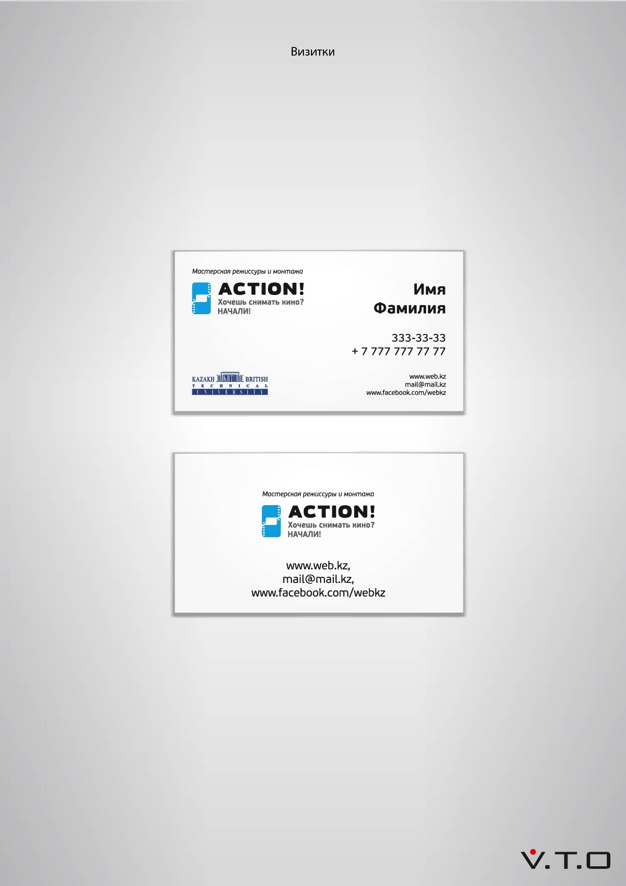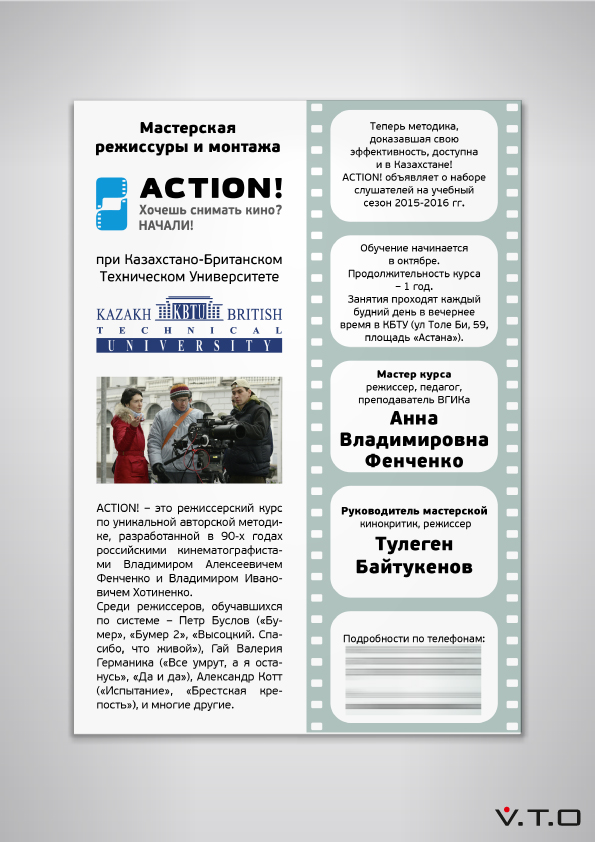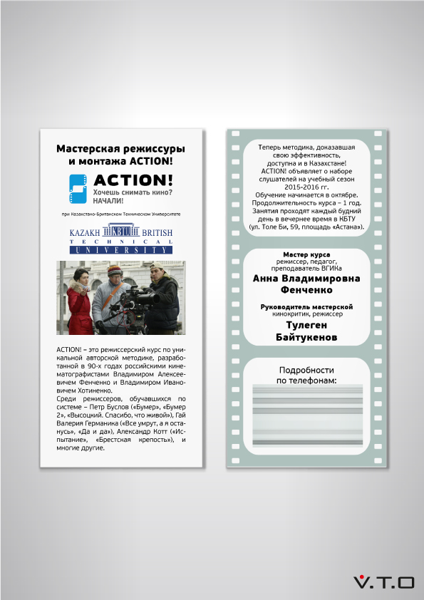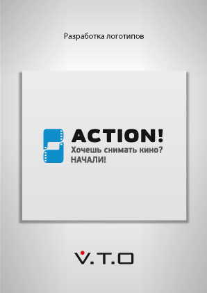 Киношкола “Action!” занимается обучением кинорежиссуре и монтажу. Идея логотипа пришла в голову сразу – кинопленка, которая трансформируется в два кулачка с оттопыренным большим пальцем. Эти кулачки символизируют фокусирование на объекте.