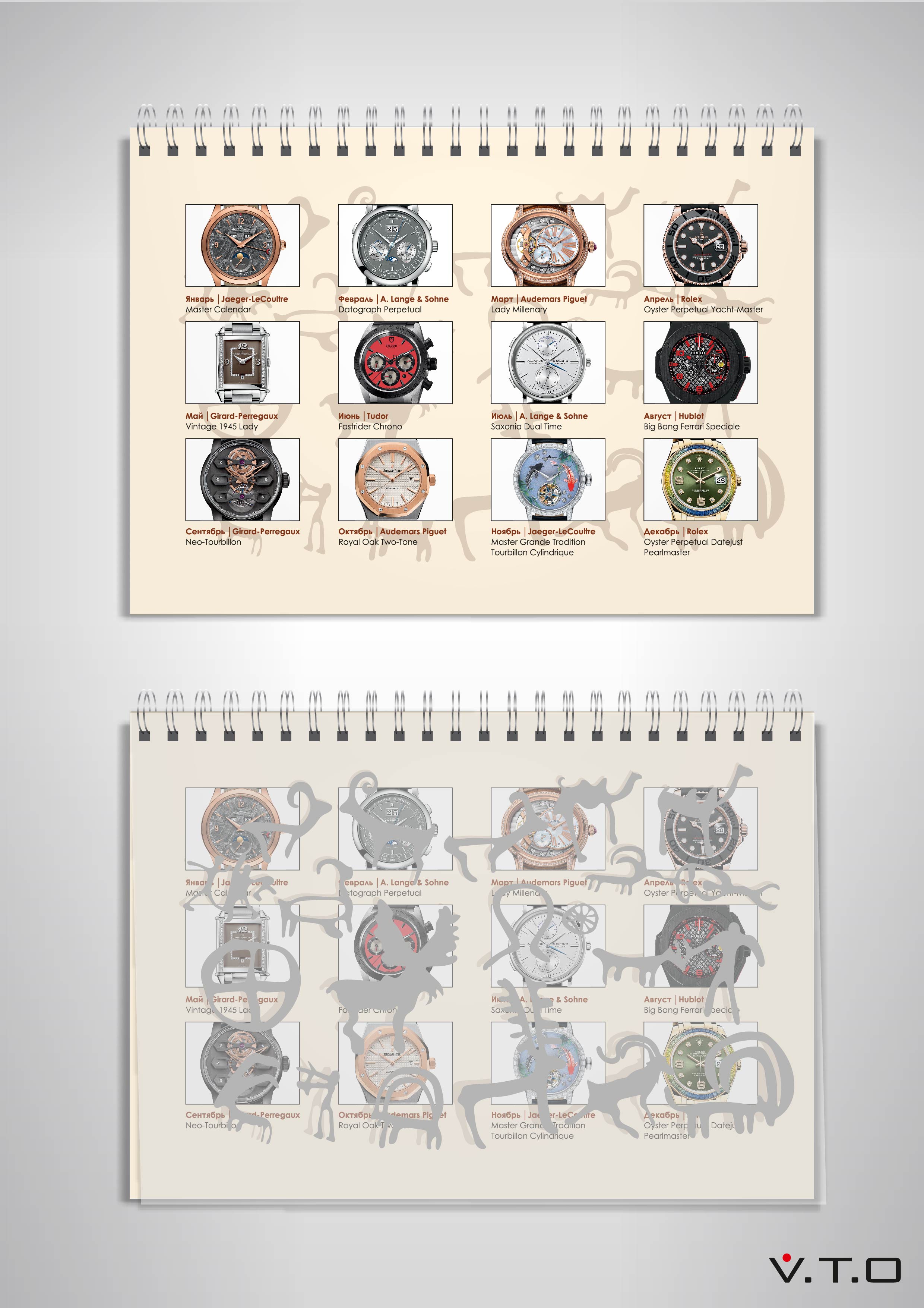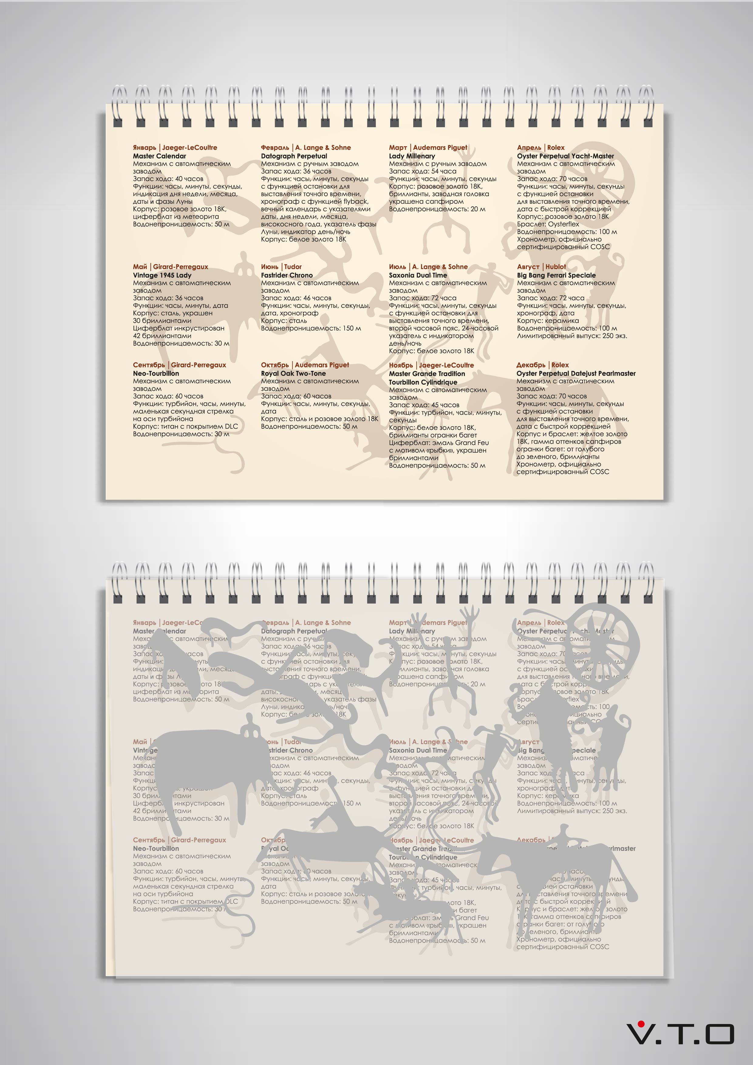 Сами листы календаря напечатаны стохастическим растром. Данная технология позволяет добиться максимальных качества печати и четкости изображения – каждый элемент, каждый механизм элитных часов выглядит как настоящий.