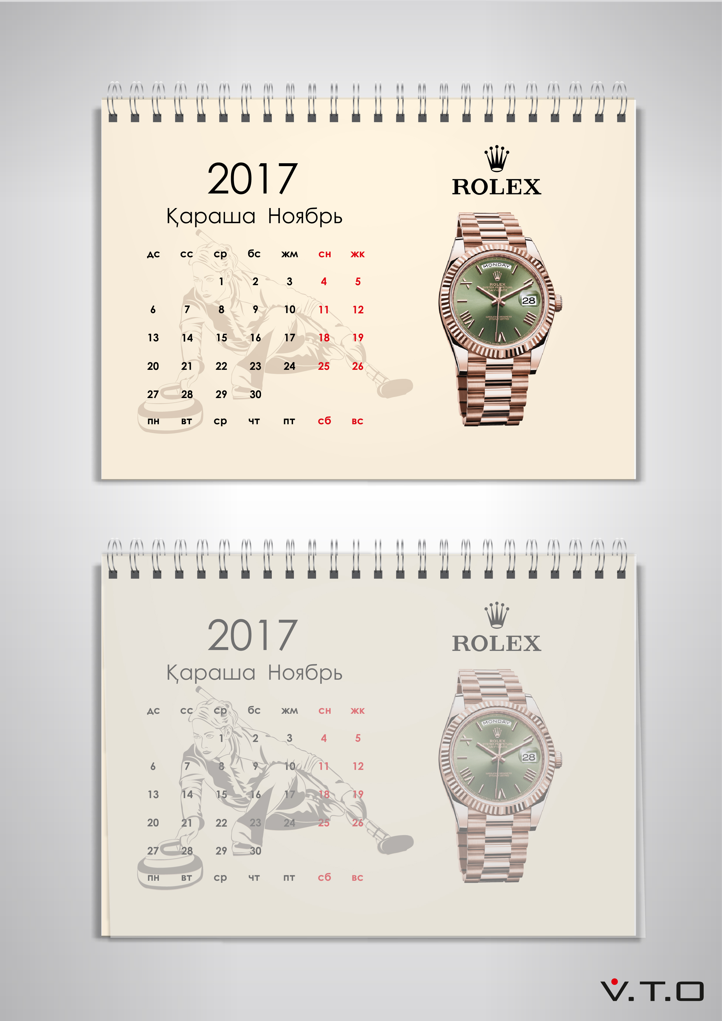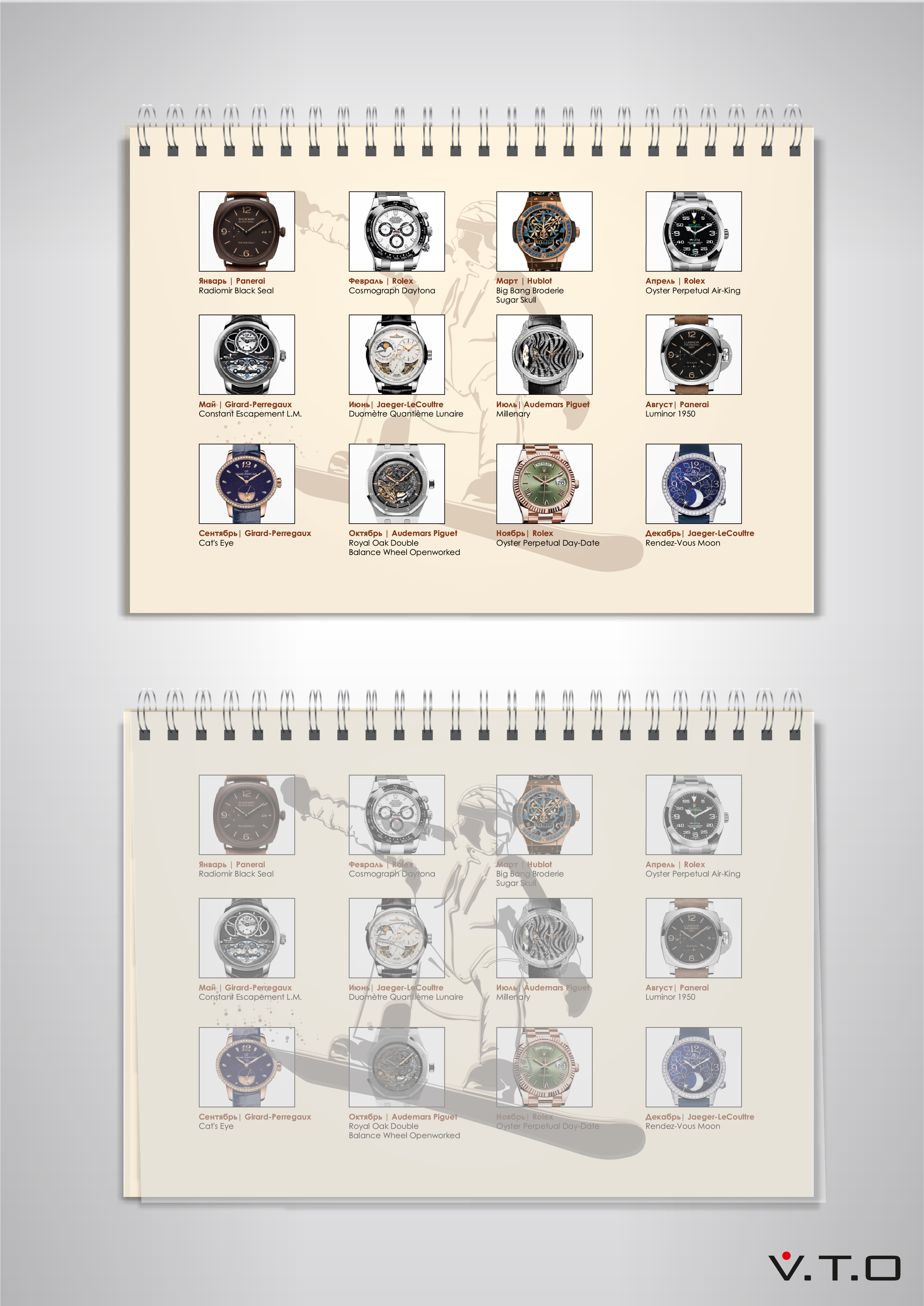 Сами листы календаря напечатаны стохастическим растром. Данная технология позволяет добиться максимальных качества печати и четкости изображения – каждый элемент, каждый механизм элитных часов выглядит как настоящий.